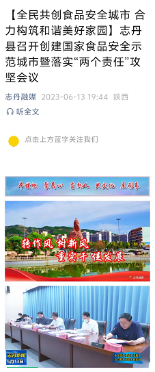 主题报道【全民共创食品安全城市、合力构筑和谐美好家园】播发:《志丹县召开创建国家食品安全示范城市暨落实“两个责任”攻坚会议》《志丹县开展“尚俭崇信尽责、同心共护食品安全”宣传活动》