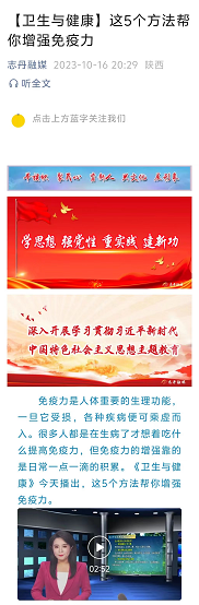 电视、微信公众平台开设【卫生与健康】》栏目,播发《这5个方法帮你增强免疫力》《如何正确缓解焦虑》