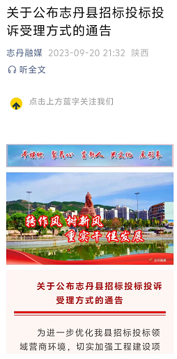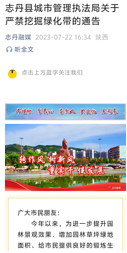 微信公众平台设立【最新通告】板块,播发《关于公布志丹县招标投标投诉受理方式的通告》《志丹县城市管理执法局关于严禁挖掘绿化带的通告》