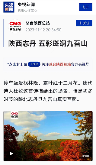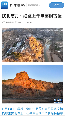 央视新闻客户端播发《陕西志丹:五彩斑斓九吾山》,新华网客户端播发《陕西志丹:绝壁上千年窑洞古堡》