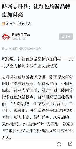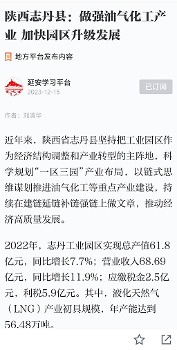 “学习强国”延安学习平台播发《陕西志丹县:做强油气化工产业、加快园区升级发展》《陕西志丹县:让红色旅游品牌愈加闪亮》