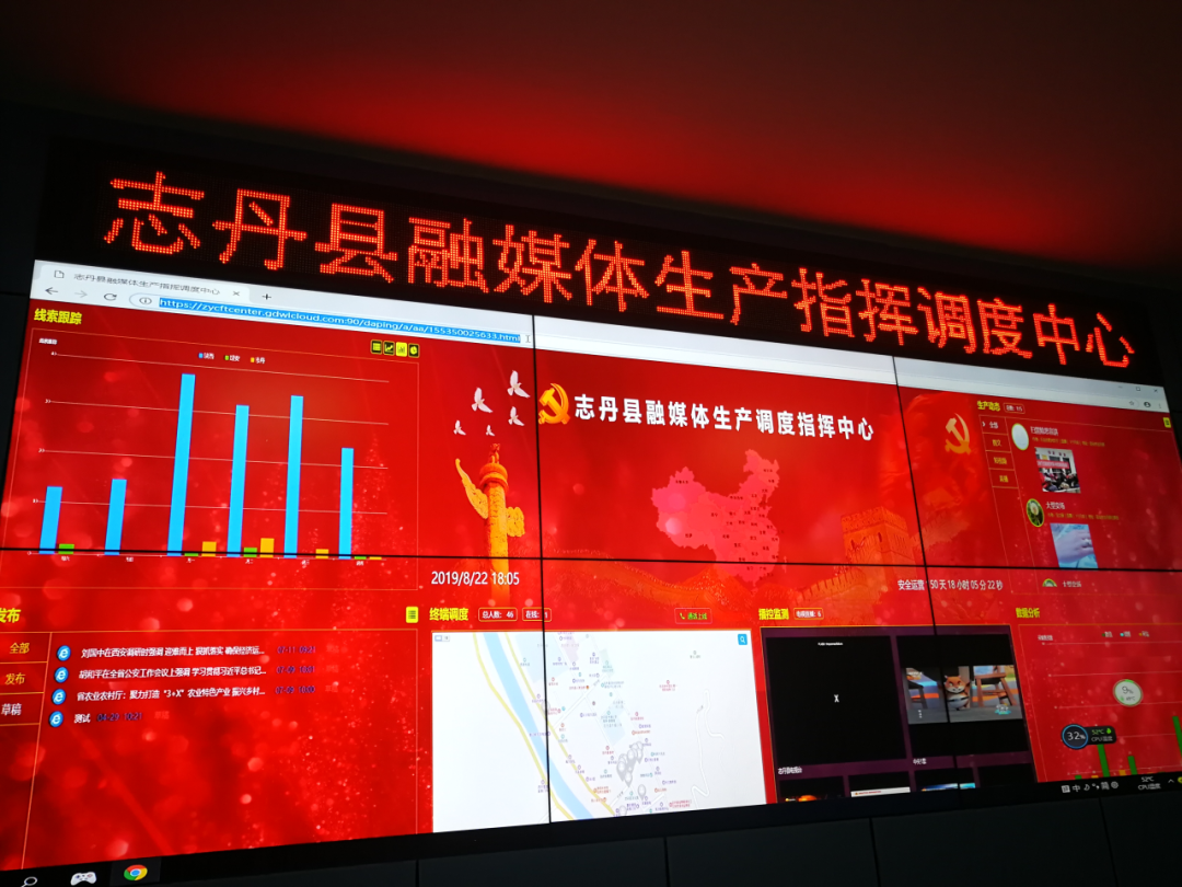 (三)融合采编平台建设。立足“高度融合、功能完善、移动为主、有利扩展”定位,按照“五个一”(即:搭建一个技术平台、建设一个移动APP、连成一个网络渠道、建造一个空间平台、构建一套运行机制)建设目标,在避免重复投资的基础上,整合利用县广电中心原有设备资源,一室多用,于2019年7月搭建完成志丹县融媒体指挥调度中心(即“中央厨房”)。同年8月1日,“爱志丹”手机APP客户端完成开发测试,开始上线运营。县融媒体中心形成以聚现为前端,“中央厨房”为中枢,广播电视、《志丹通讯》、微信公众平台、“爱志丹”手机APP、政府网站等为终端的,包括前期调度、采写、直播、上传,中期整理、制作、生产、分发和后期多平台发布的媒体链条。